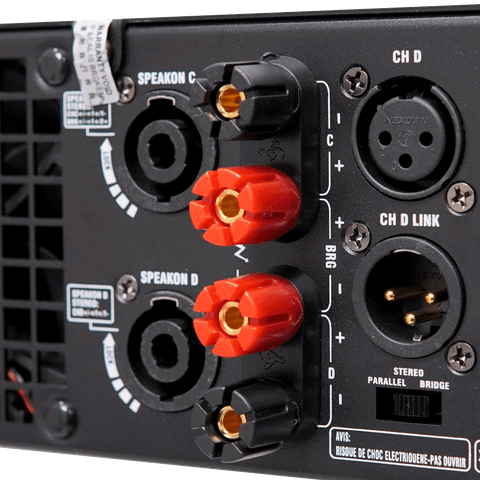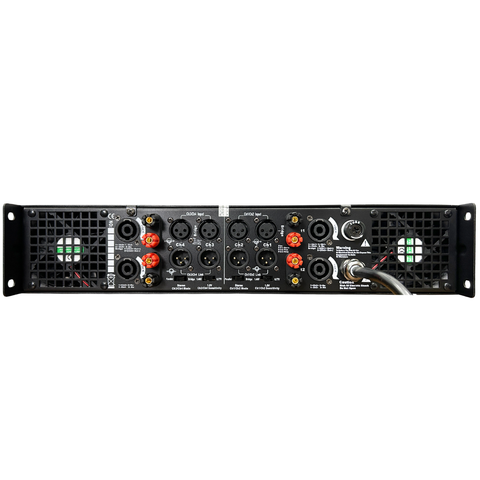 Mặt sau của máy là một hệ thống cổng kết nối đa dạng và chuyên nghiệp, bao gồm đường vào tín hiệu XLR và đường ra loa Speakon. Sự trang bị này đảm bảo việc phối ghép với các thiết bị khác trong dàn âm thanh từ mixer, vang số đến loa diễn ra một cách nhanh chóng, ổn định và cho hiệu quả truyền dẫn tín hiệu cao nhất.